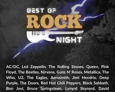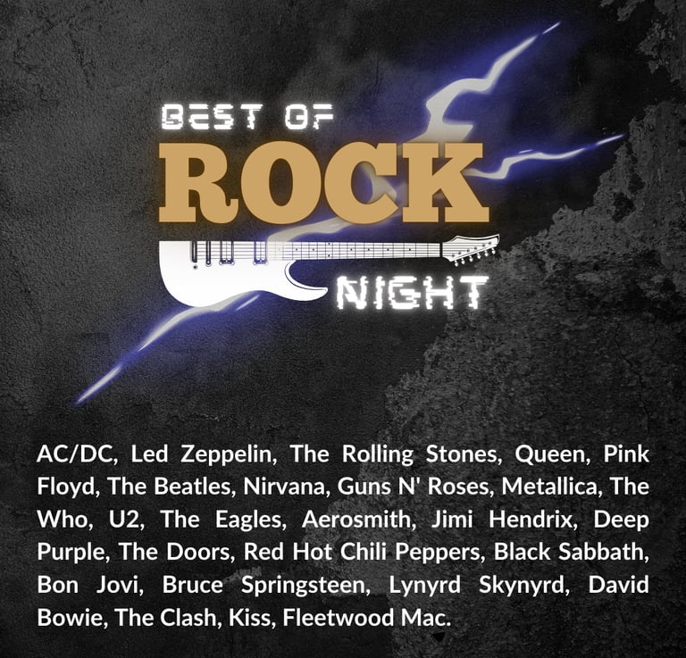Liebe Rockfans, es ist Zeit, die Gitarren auf Maximum zu drehen und die Verstärker bis zum Anschlag aufzufahren! Willkommen zur Best of Rock Night – der ultimativen Party für alle, die den wahren Sound des Rock'n'Rolls im Blut haben. Hier steht nur eines im Mittelpunkt: Die Musik, die uns seit Jahrzehnten begleitet, bewegt und beflügelt.